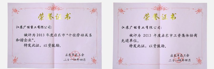 2014年4月29日啟東市委市政府和市總工會在市行政中心舉行主題為“中國夢勞動美”五一表彰大會,對2013年度全市各條戰(zhàn)線上涌現(xiàn)出來的先進(jìn)集體和先進(jìn)個人給以表彰,我單位被授予“啟東市2013年度十佳和諧企業(yè)”和“啟東市2013年度工資集體協(xié)商先進(jìn)單位”。